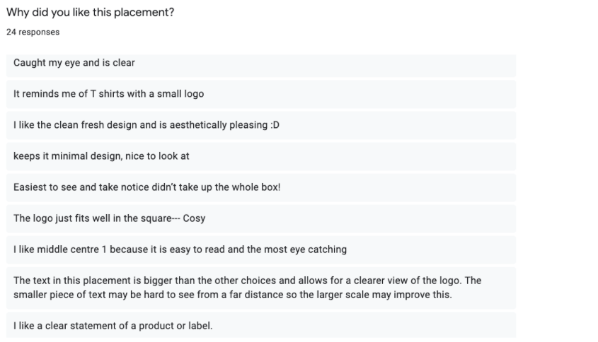Here I made a google forms to find the right placement of the logo and recipe designs on the boxes. My personal favourite placements were the top left corner (2) and the middle centre (1) so I was assuming and hoping that my target audience group would agree with me. I received 21 responses. The first question I asked was their age, and over half were 30-60 year olds. This is because I had help distributing it from the same people as my logo design questionnaire. As previously explained, this was useful due to the fact it covers a rough average of my target group, 20-85 year olds.
